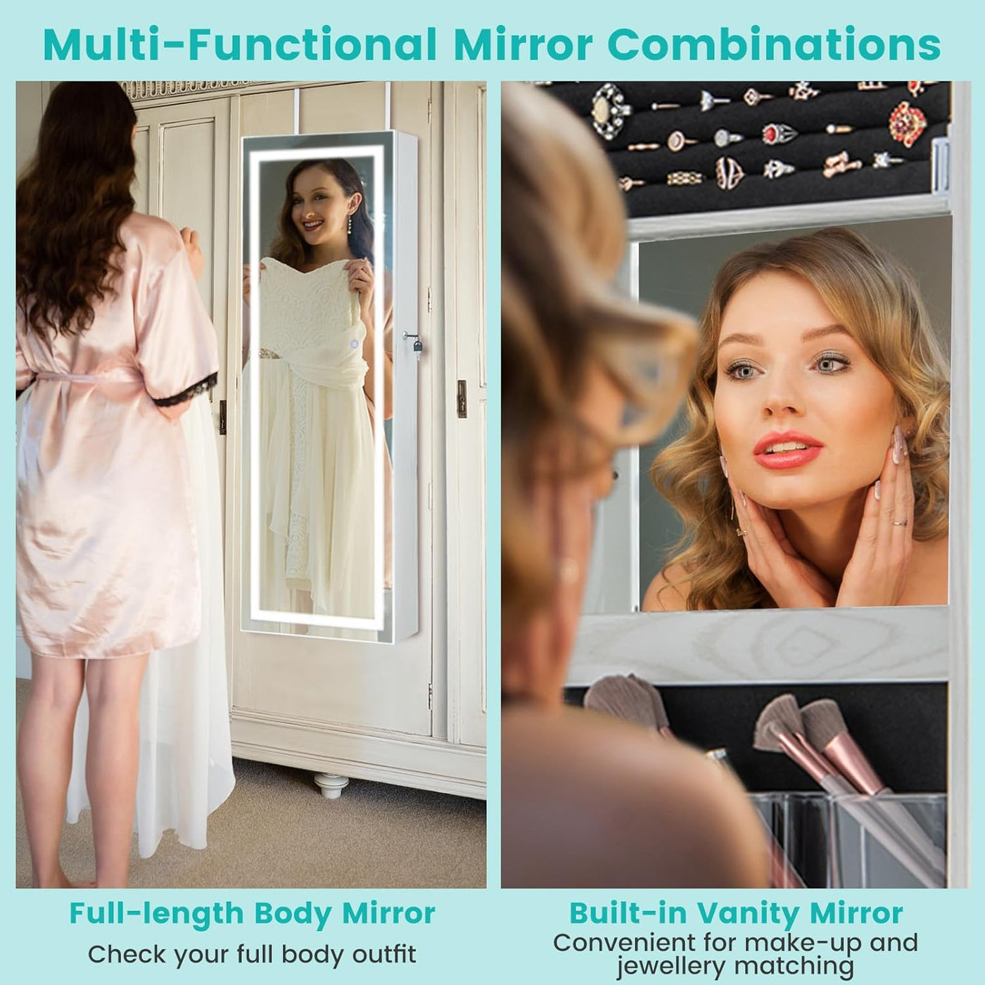 I absolutely love this mirror cabinet! The lighting is gorgeous — perfect for doing my makeup — and it holds so much jewelry. The lock gives me peace of mind, and it looks beautiful in my bedroom. Total game changer!
